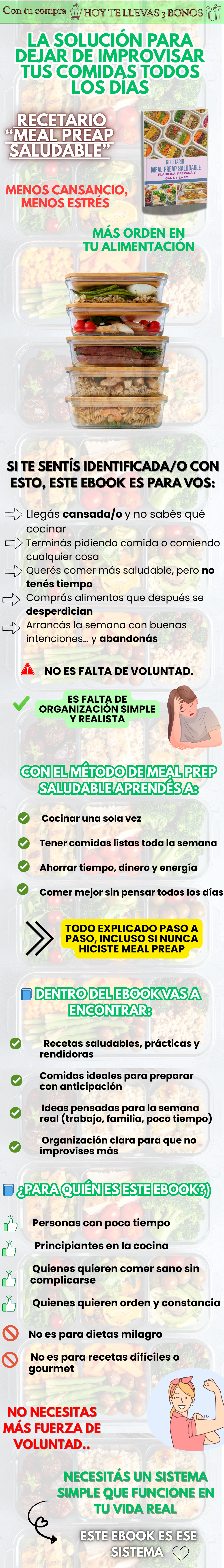 El meal prep es una forma de organizar y preparar comidas saludables con anticipación. Este recetario es ideal para personas ocupadas, mamás y quienes entrenan y quieren comer mejor sin perder tiempo.