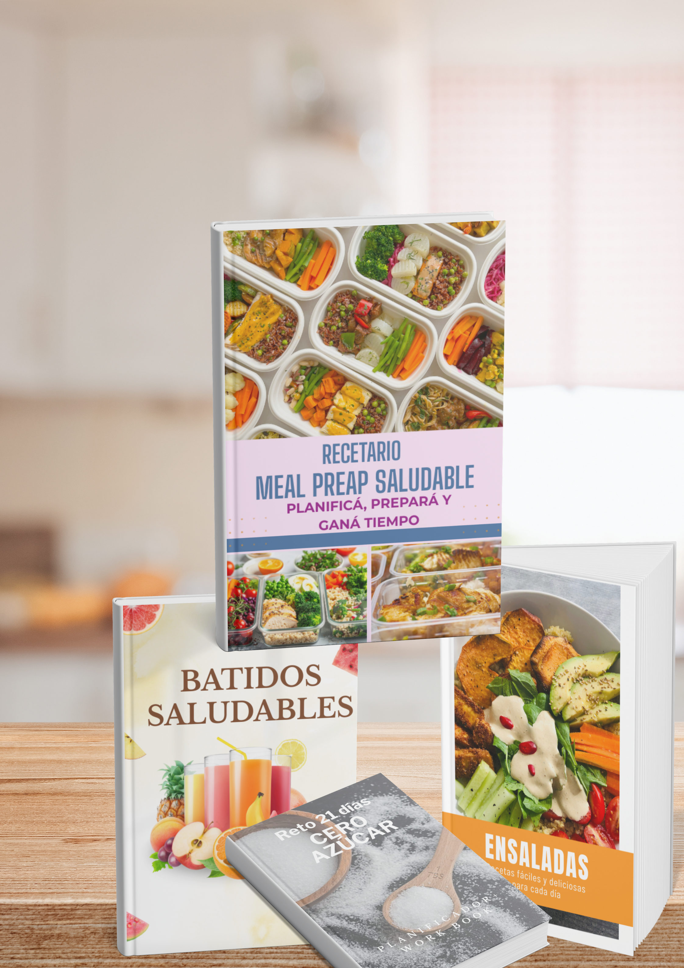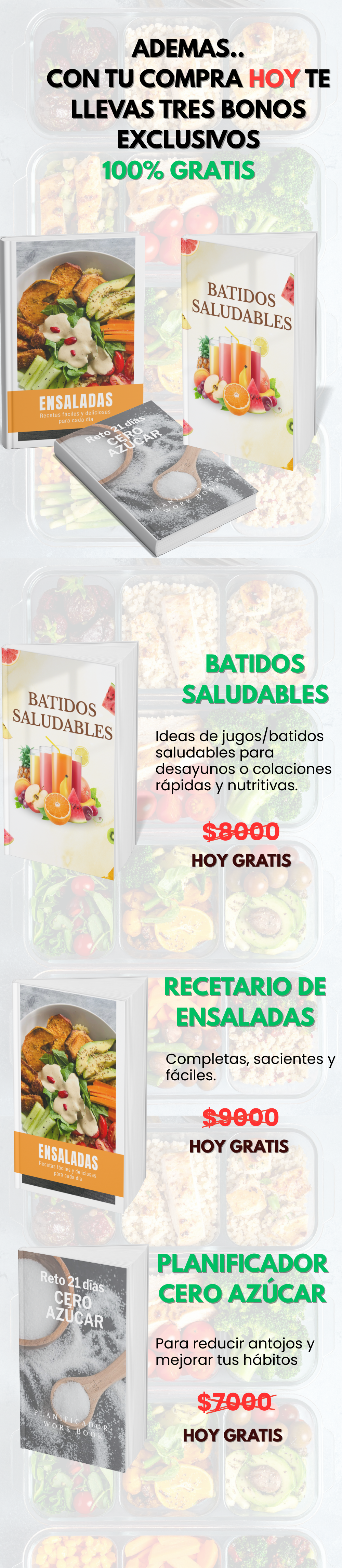 Incluye bonos exclusivos como batidos saludables, planificador cero azúcar y un recetario extra de ensaladas para complementar tu organización semanal.
